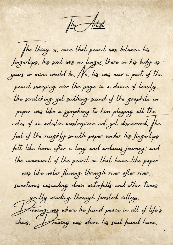 Writing: I have always loved writing. Describing something to the most intimate detail ensures full encapsulation & pleasure of the reader & their complete immersion in a piece of writing. A picture can tell a thousand words, but a good piece of writing can invoke cascades of emotion falling like a waterfall through a person’s soul.